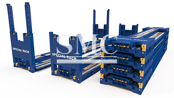 Flat rack containers may also be known as flat bed or platform containers. The two longest sides or walls that are formed of steel in general purpose or reefer containers are missing. They are characterized by the fact that they have no superstructure but instead have fixed or collapsible ends as well as lashing points for securing the cargo. The ends on this type of container, therefore, not only characterize the container but also define how they are packed, unpacked, stacked and stored.