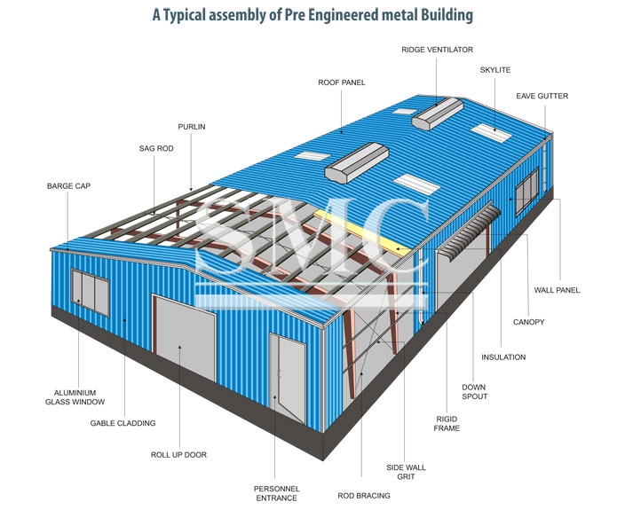 The most economical cladding for these structures is light corrugated metal sheeting, on both the roof and the external walls. These steel sheets, barely 0.5mm thick, are coated with an aluminum-zinc alloy for corrosion protection on both sides, and are given an attractive, durable paint finish on the outside in the factory. These sheets are introduced over a network of purlins, a steel part that lays on the fundamental basic edge and backings the roofing material. In pre-built structures, icy framed Z segments are the individual from decision for purlins.