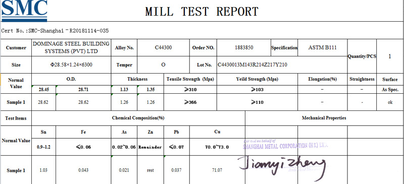 Condenser Tube, C4430T-O, OD: 28.58mm, Wall Thickness: 1.24mm, Length: 6300mm. Quantity: 4600 PCS