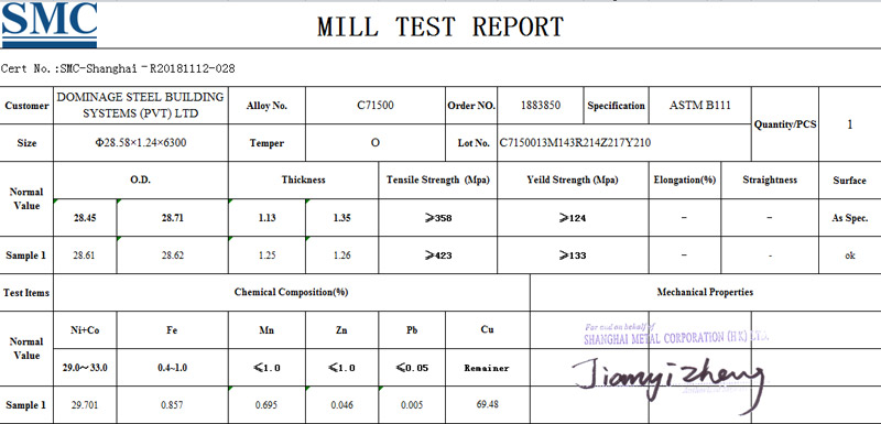 Condenser Tube, C7150T-O, OD: 28.58mm, Wall Thickness: 1.24mm, Length: 6300mm. Quantity: 160 PCS